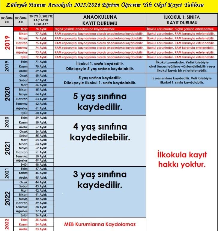 Değerli velilerimiz, 2025 - 2026 Eğitim Öğretim yılı için öğrencinin hangi sınıfa kaydolabileceğini açıklayan tablomuz aşağıda mevcuttur. Öğrencinin doğduğu yıl ve aya göre, 2025 Eylül tarihinde kaç aylık olacağına göre okula kayıt yaşı hesaplanmaktadır.